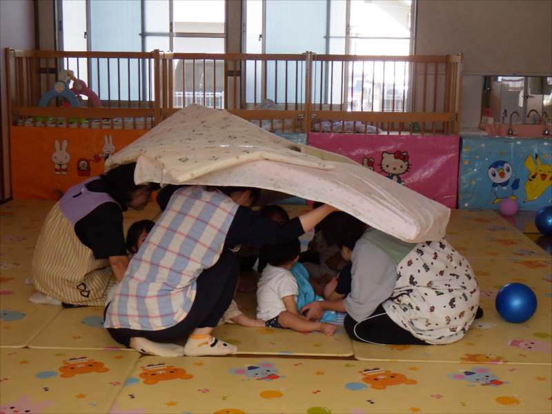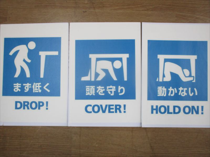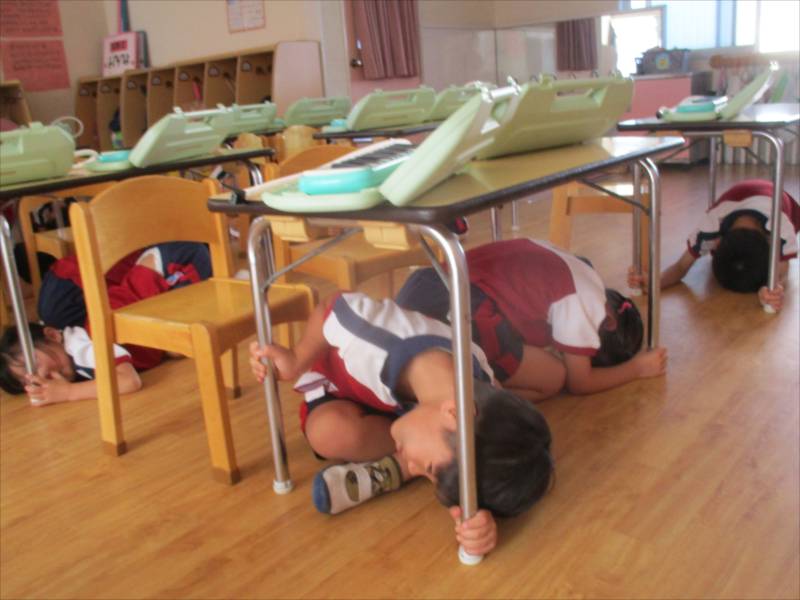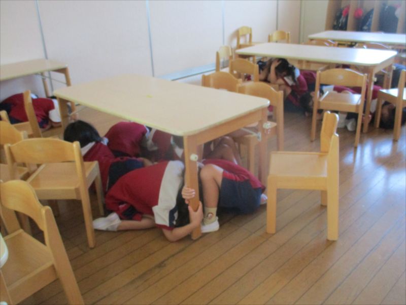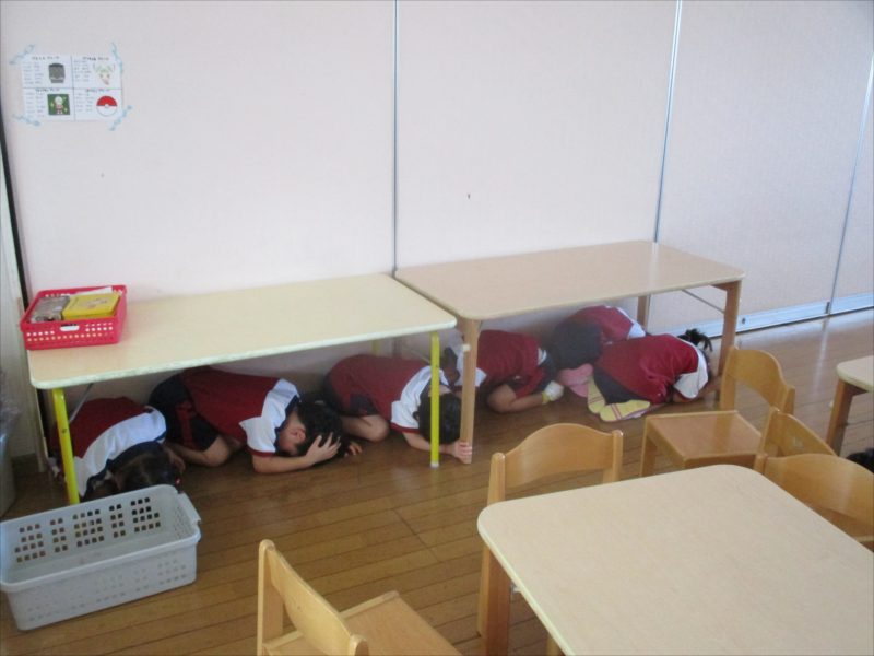 地震発生時は素早く、机の下など安全な場所に、身を低くし頭を守り避難するように伝えます。