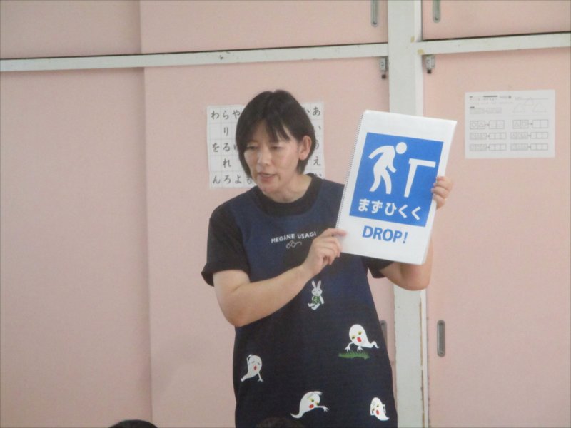 今日は地震の避難訓練を実際に行いながら、シェイクアウトの意味や姿勢について、子どもたちに分かりやすくお話しています。
