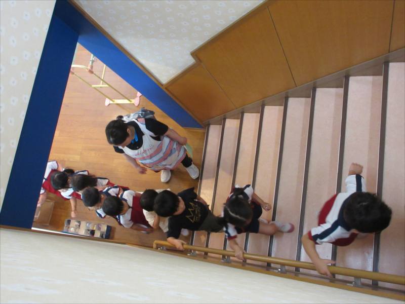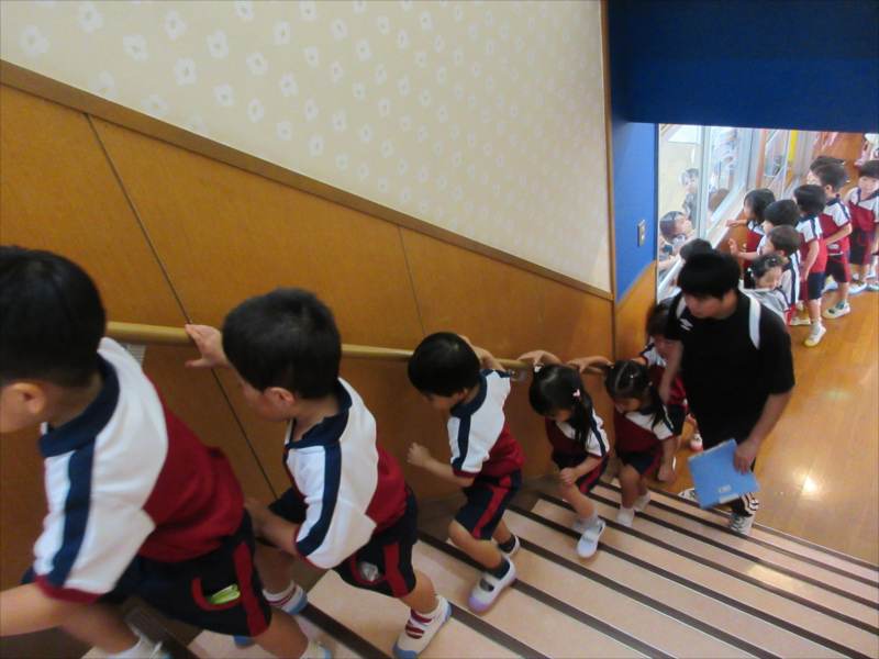 保育園では、2階の職員室が一番高い場所なので、水が1階に浸水してきたら職員室へ避難することを伝え、実際に訓練しました。
