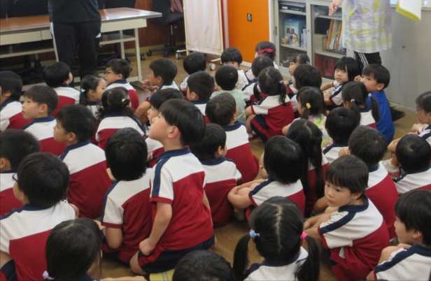 避難訓練後に、シェイクアウト訓練の意味について、保育士から話がありました。