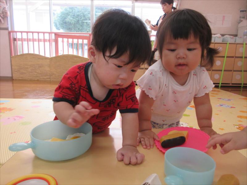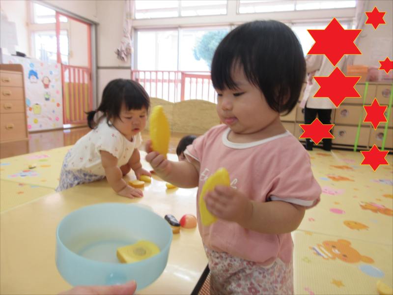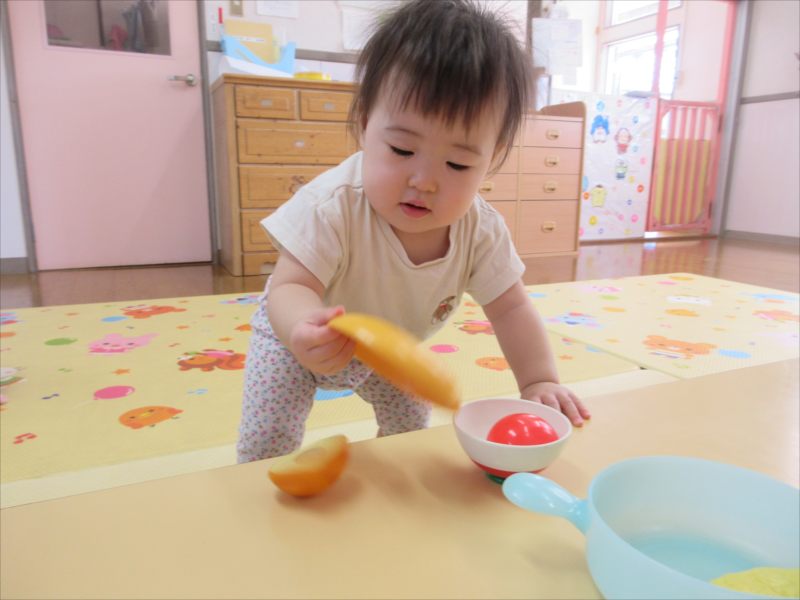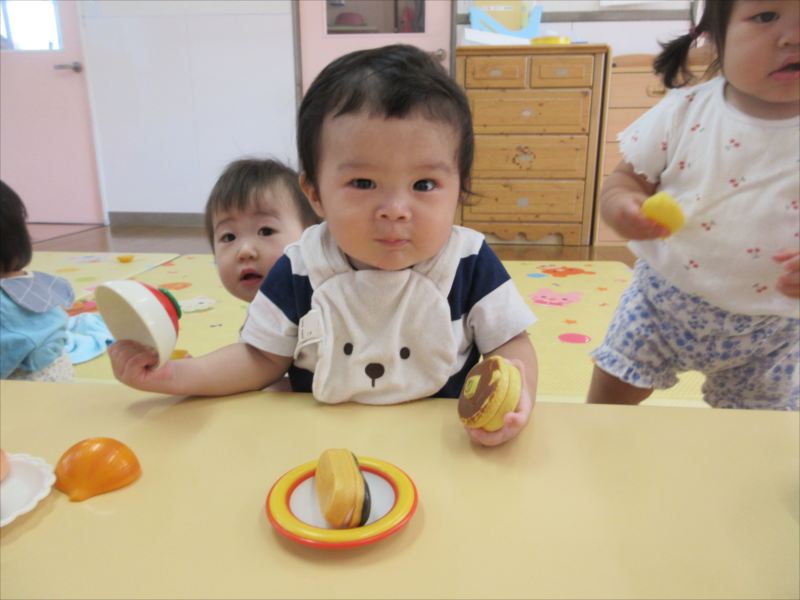 おままごとをして遊びました。お皿に食べ物を乗せてみたり、道具を触って確かめてみたりして楽しんでいました。
