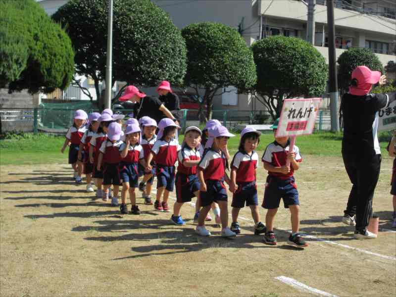 担任保育士の誘導がなくても、自分たちで歩幅を合わせて歩きます。