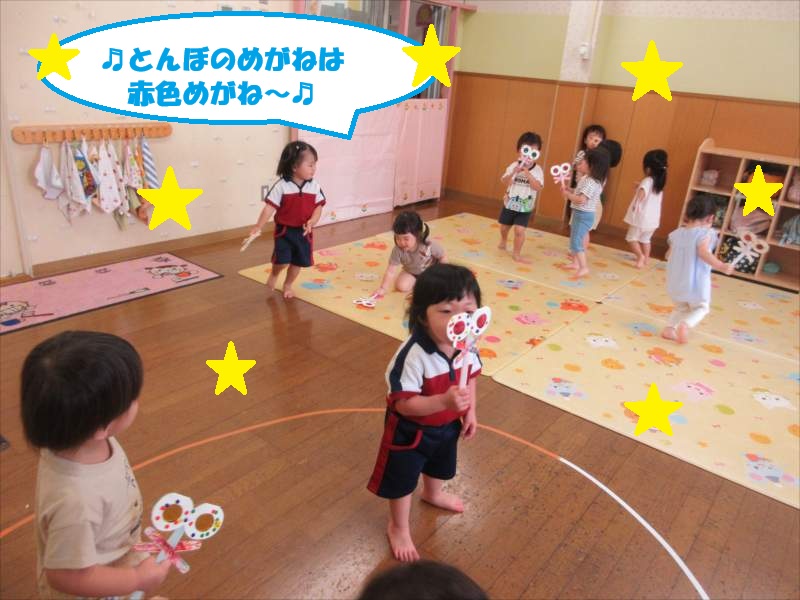 夏の日差しも少しずつ和らぎ、秋の雰囲気が感じられる季節になりました。園庭には赤とんぼがスイスイと飛ぶ姿が見られ、子どもたちは「とんぼー!」と興味津々に眺めたり、「トンボのめがね」の歌を嬉しそうに唱っています(*^^*)
