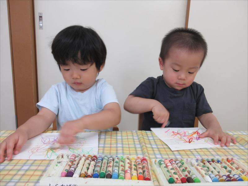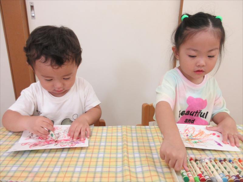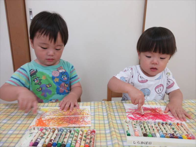 好きな色のクレヨンで羽を塗り、カラフルな羽をつくったよ!