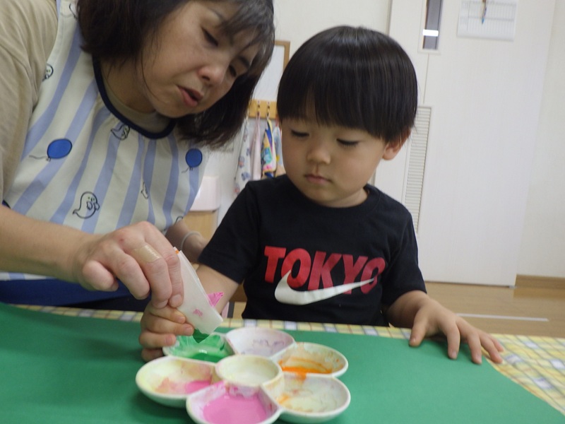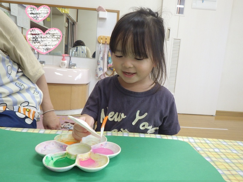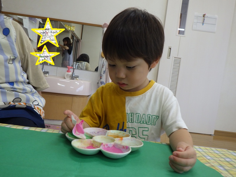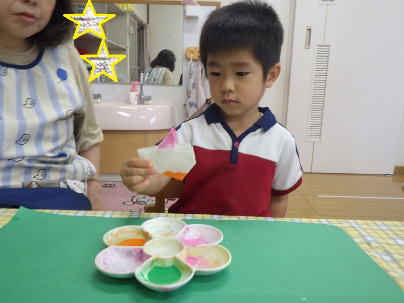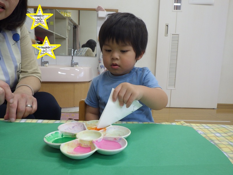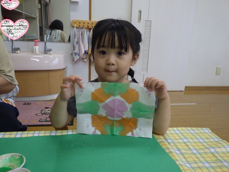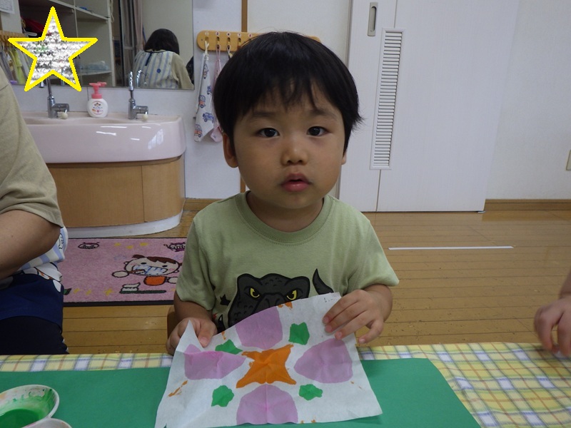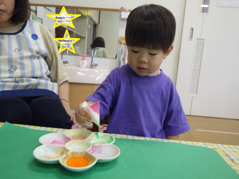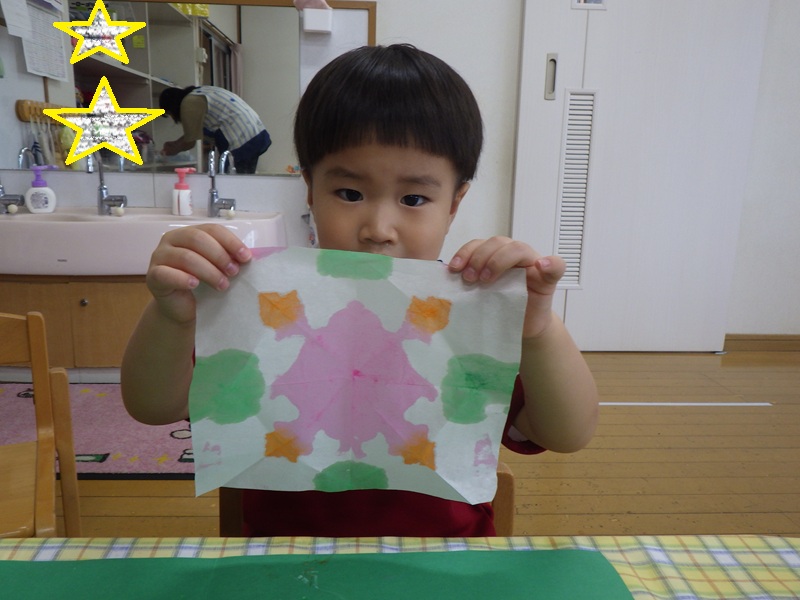 和紙染めをするよ~と伝えると興味津々だったすみれ組さん! その様子をご覧ください! 色を付け終わり広げてみると「じゃーん!」と見せてくれました🎵 とても上手にできていました🎵 これからも季節にあった製作を取り入れていきたいと思います!