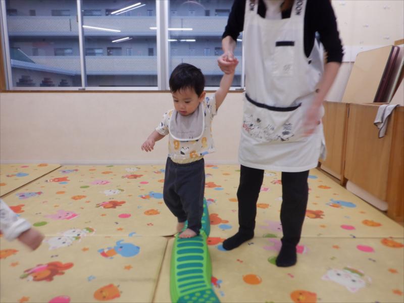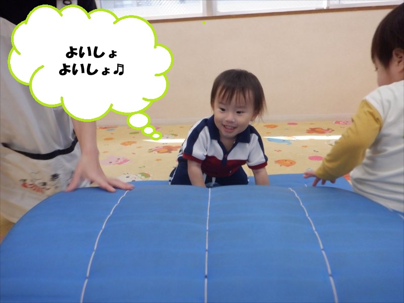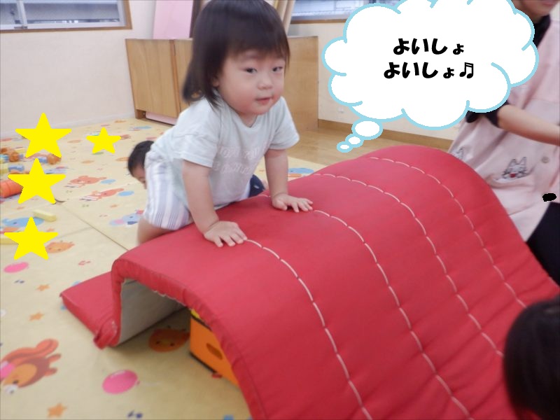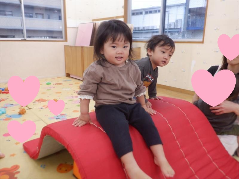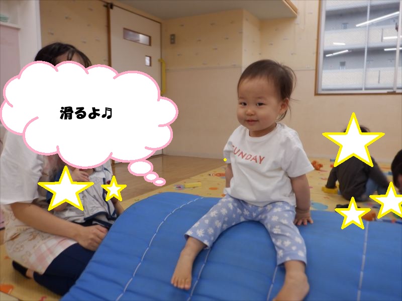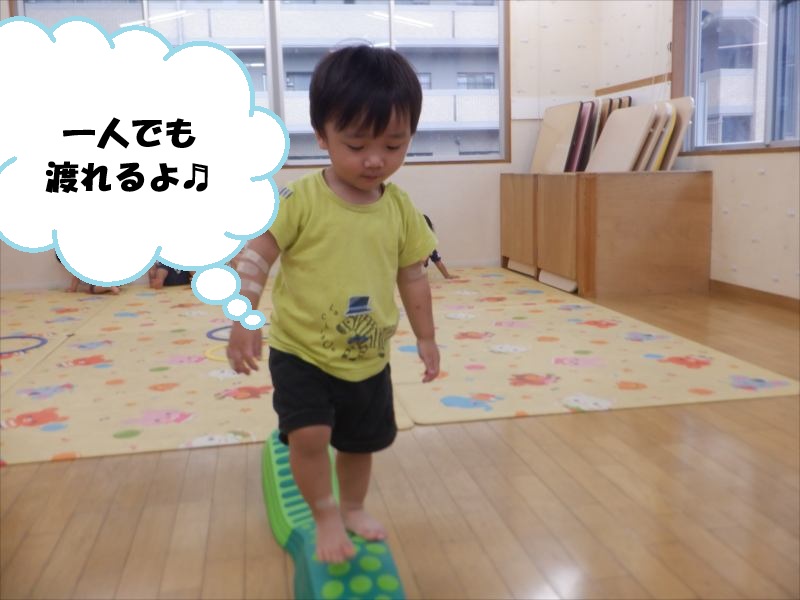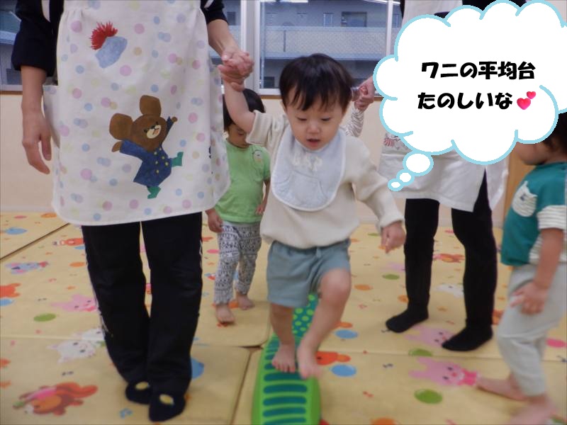 先日、子ども達が参加できる運動をピックアップして、を行いました!今回は、跳び箱の上にマットを重ねたマットすべり台  ワニの平均台