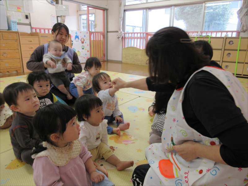 絵本の読み聞かせの前は、手遊びで始まります。🎵トントントンアンパンマン♬