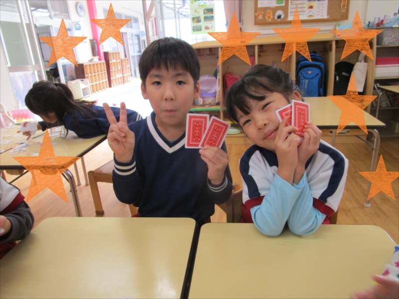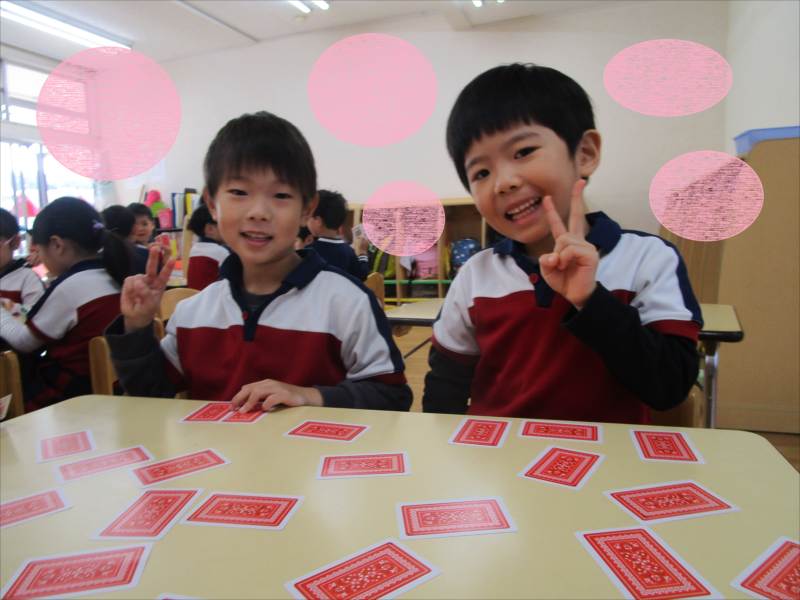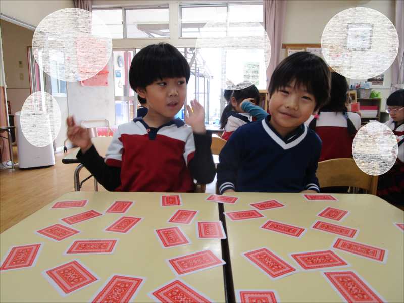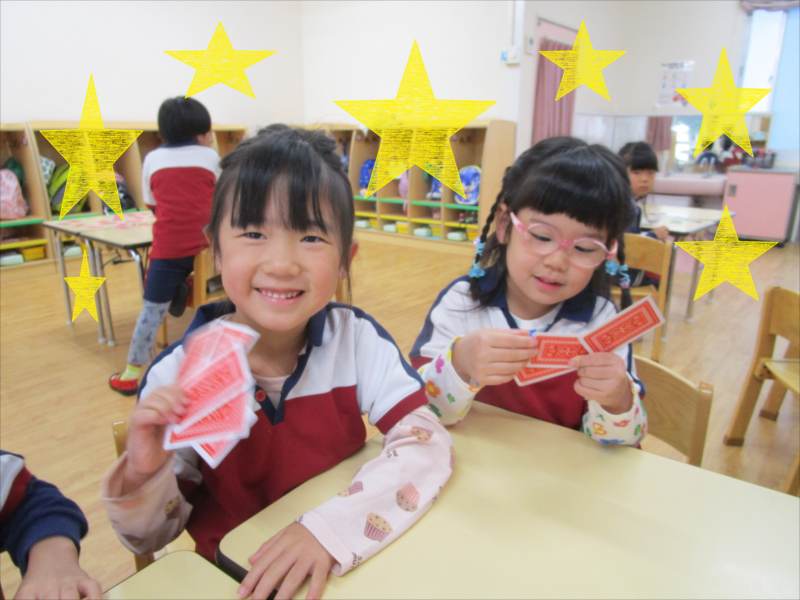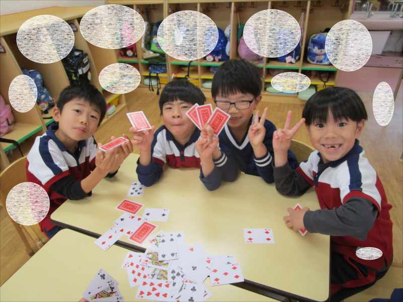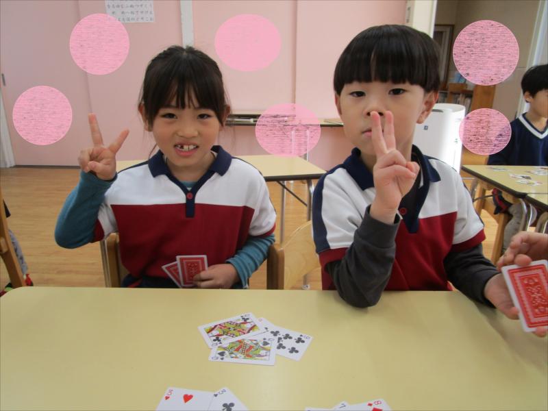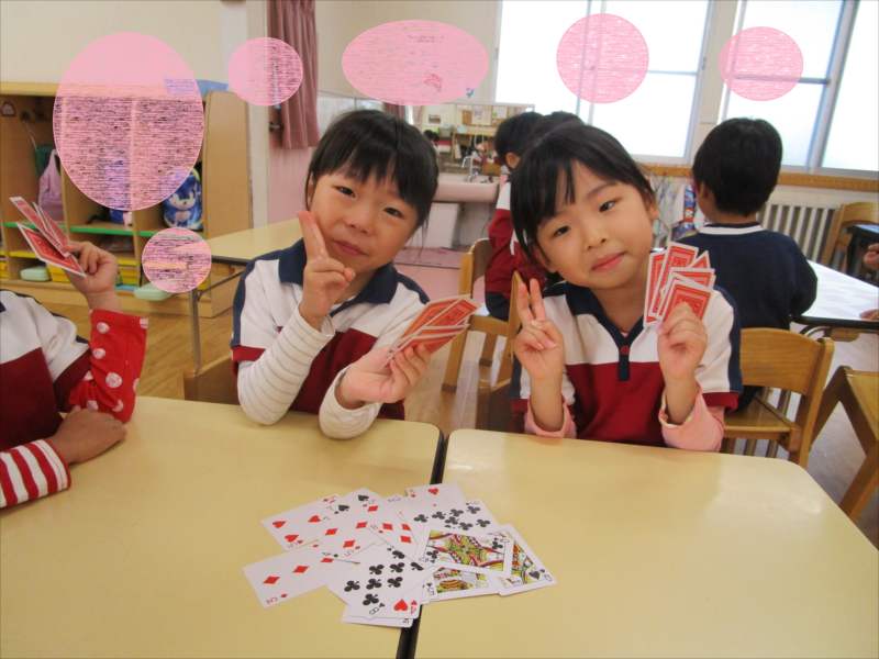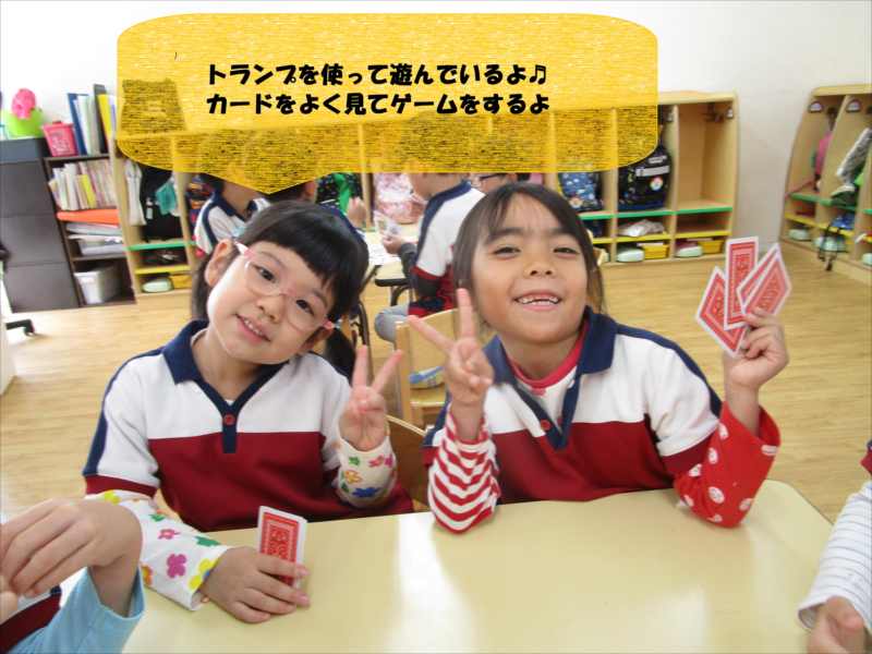 のこりのカードもわずかになってきました。「ババは誰が持っているのかな?」「あやしいなー」とお友だちの顔を見ながら・・・考えています💦
