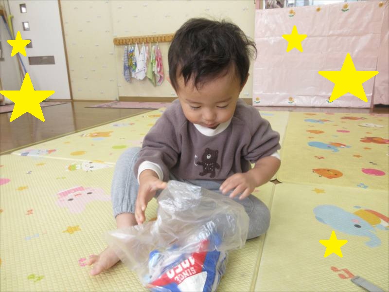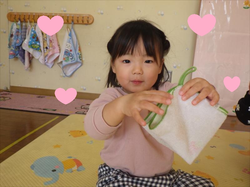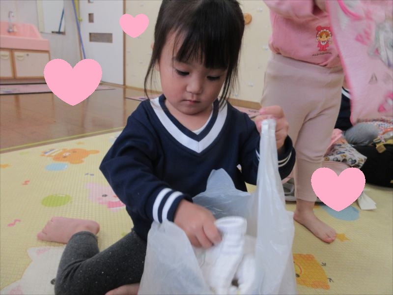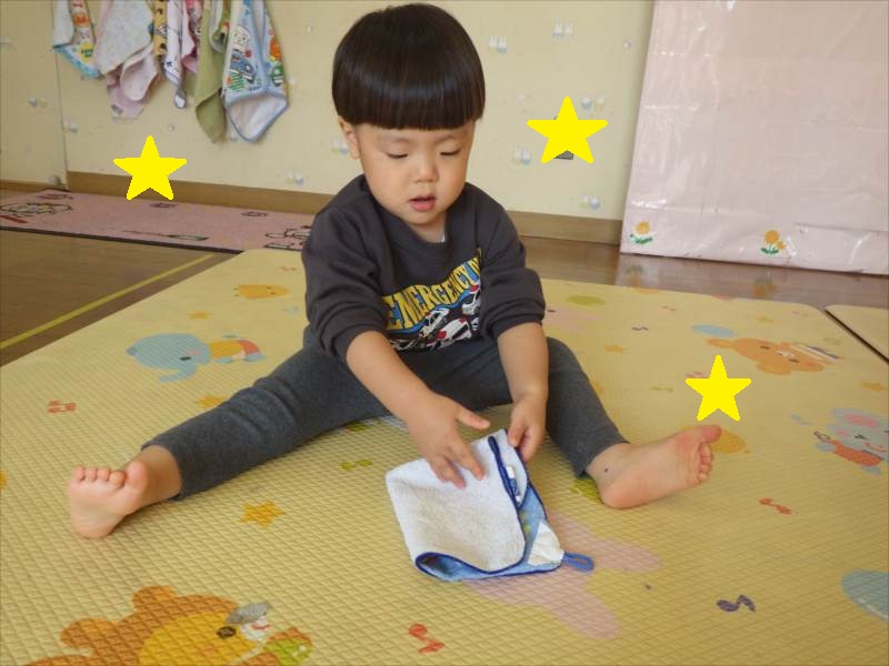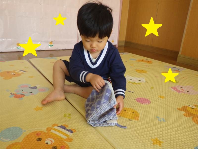 *たたんだタオルを、自分で袋に入れられるよ*