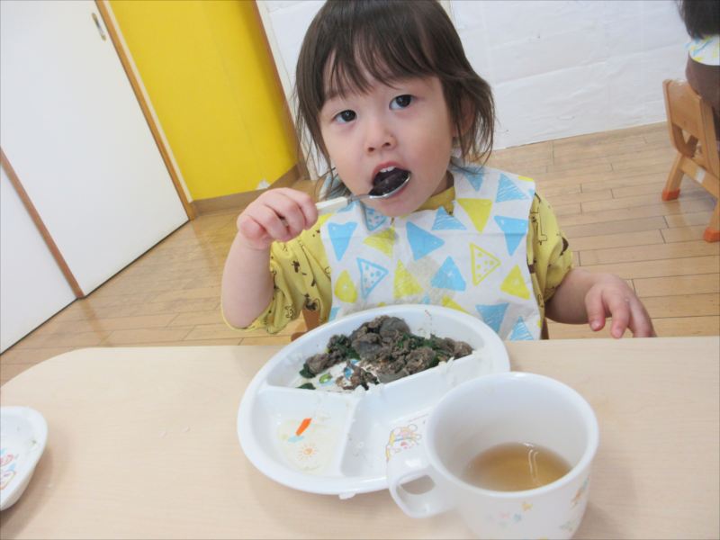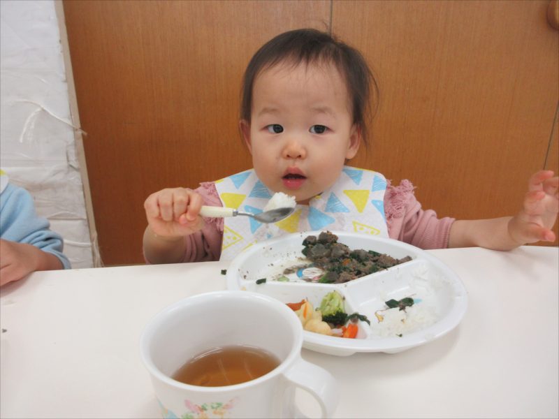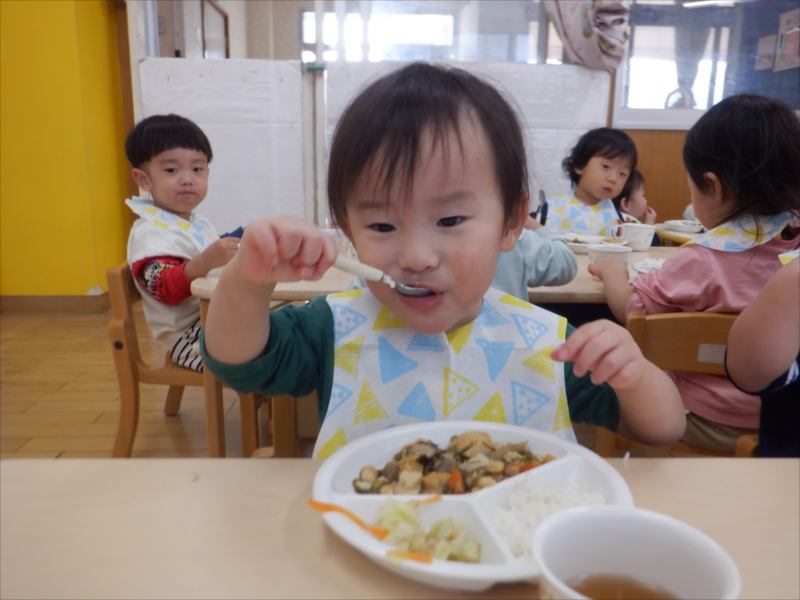 美味しそうに給食を食べている姿が、とても可愛いですね🌈スプーンの持ち方やコップ飲みが上手になってきて、