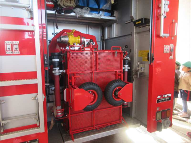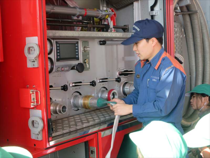 🚒「ホースをつないで、レバーを空けたら、5秒くらいででるよ!」