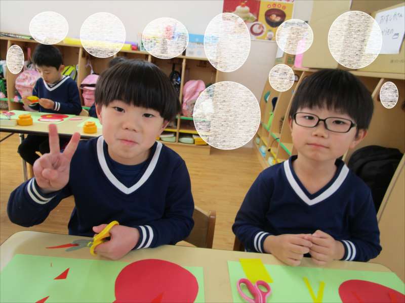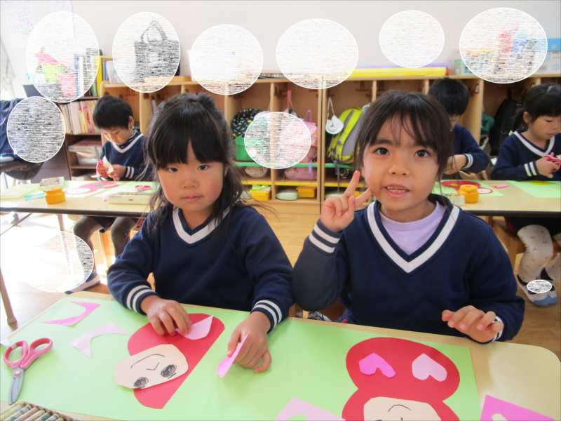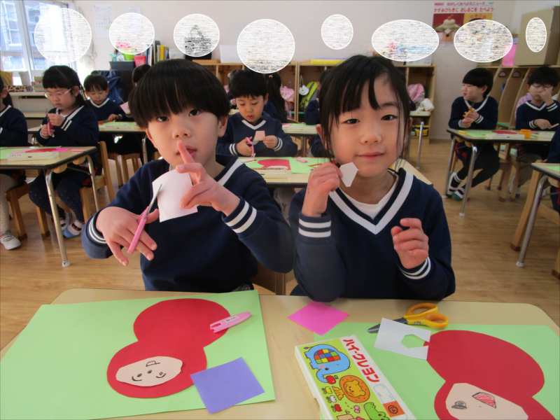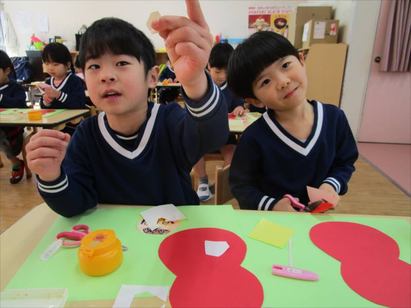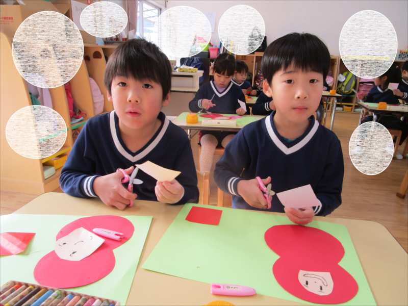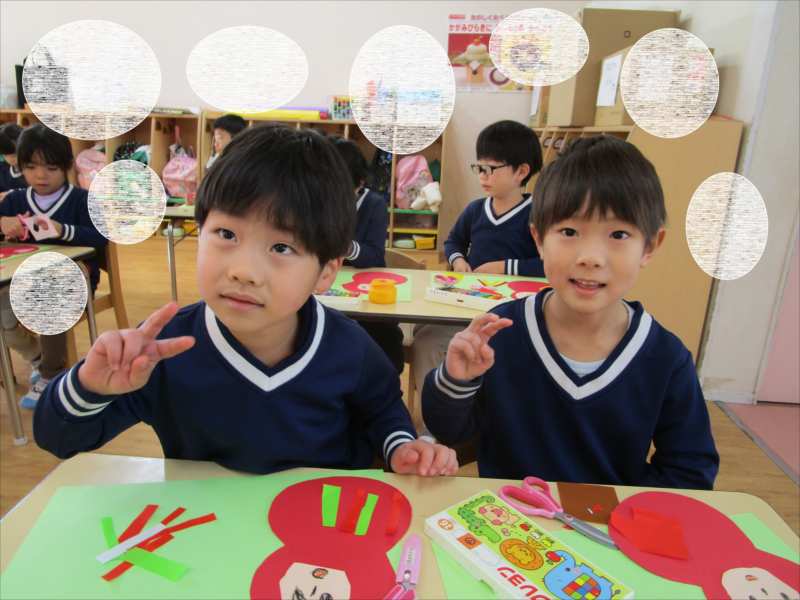 「そろそろ・・・だるまの顔が出来上がるかな?」お友だちと、だるまの顔を見せ合いこしました。