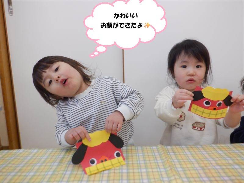 獅子舞では、ダンボールスタンプを一つひとつ丁寧に押したり、顔のパーツを一生懸命に考えながら貼る姿がとても微笑ましかったです💖