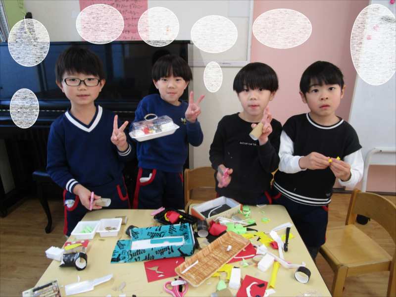 話し合いから・・・様々な廃材を使って、「こんな物つくりたい♪」「これもいるよね」と考えながら作っていきます😊