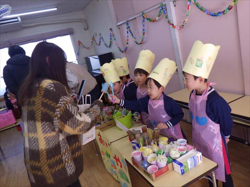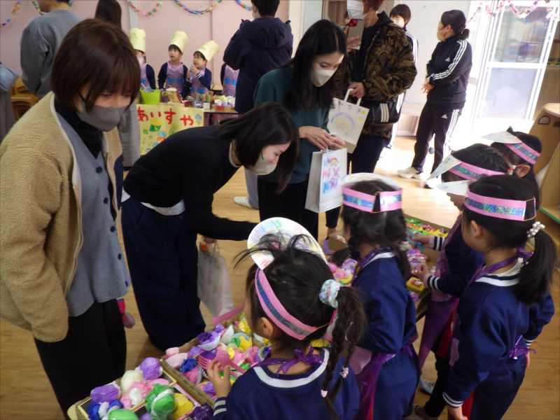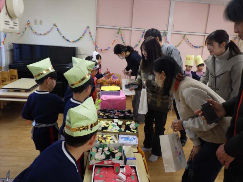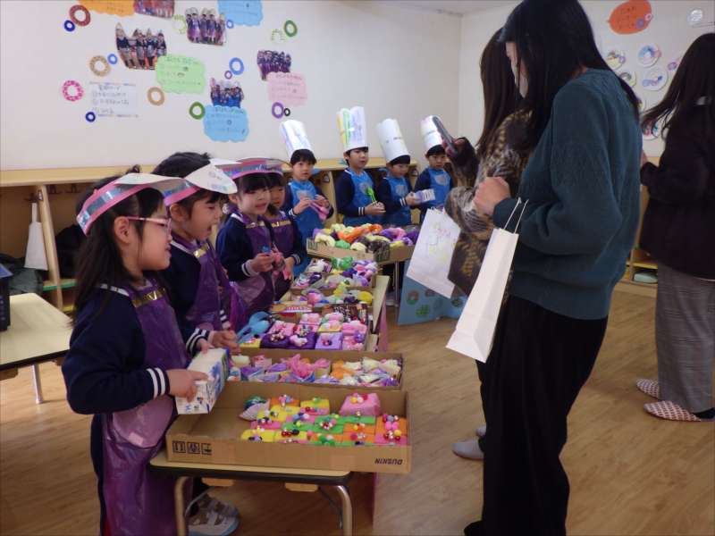 保育園生活最後の保育参観となった、ひまわり組さん🌻茶道教室で教わったお作法を見てもらいながら、心をこめて保護者の方にお茶を点てました。その後は、「お店屋さんごっこ」しました!!12月から子どもたちで、話し合いながら様々な食べ物を作っていき、当日はお店屋さんになって保護者の方にお買い物をしてもらいました☆彡