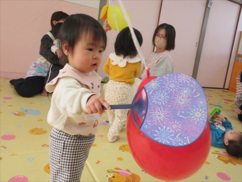 始める前に、「こうやって遊ぶんだよ」「ぽん♪って当ててみよう」と見本を見せながら伝え、子ども達と一緒に遊びました