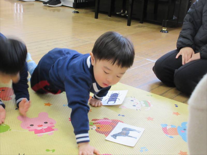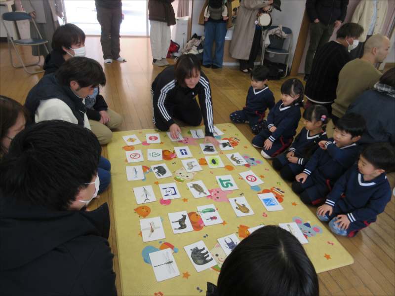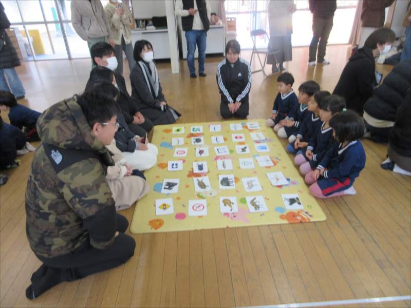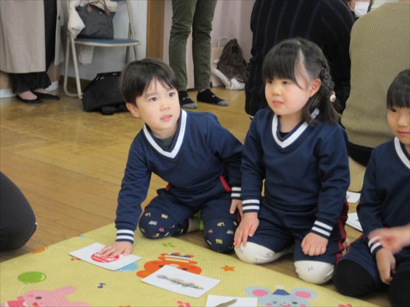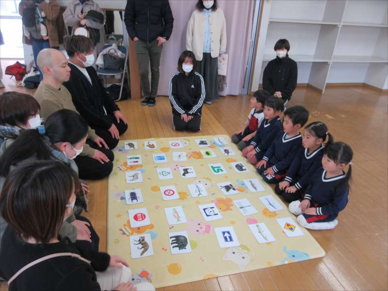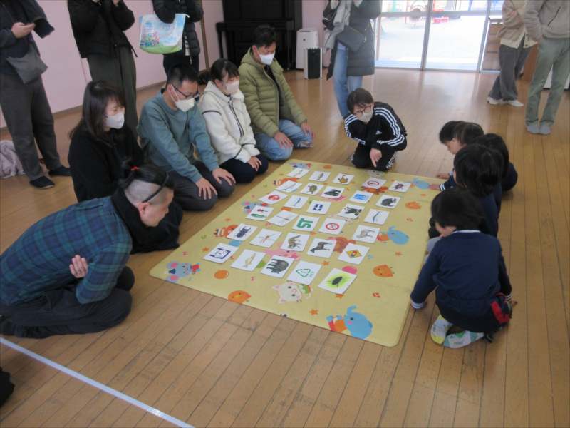 保育参観では、これまで遊んだカードを使って、保護者の方と一緒に、カルタとりに挑戦。