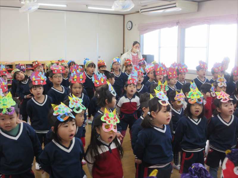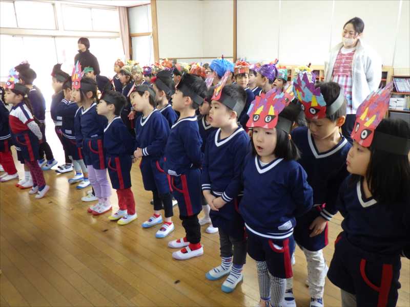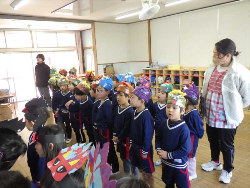 まずは、代表のお友だちが、各クラスで製作した鬼のお面を、紹介してくれました。