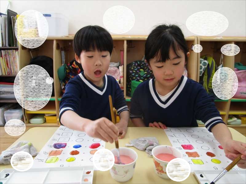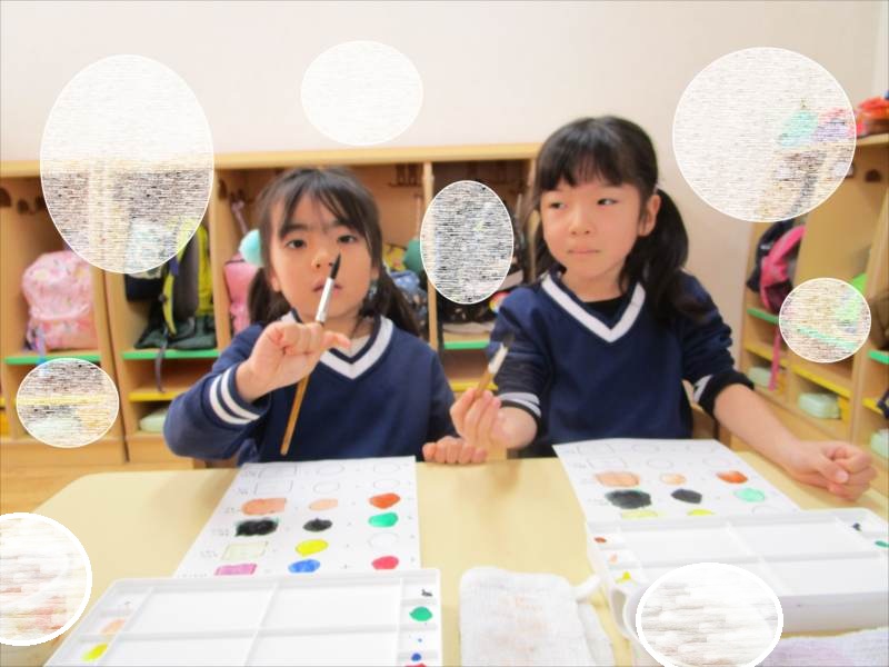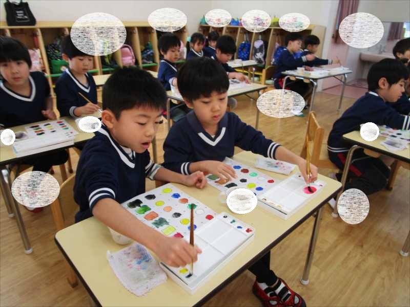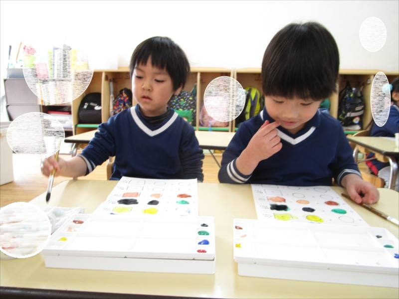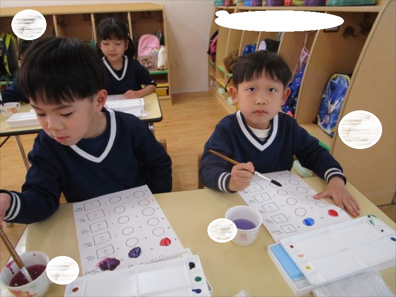 「筆をつかって丸の中を塗っていくのが難しいよー」と苦戦しながらでしたが 少しずつ上手になっています(^O^)