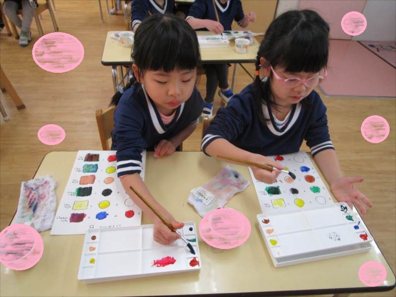 「ピンクになったよ」「見てみてーきれいな色になった」と色の変化に気付き、楽しんでいました!!