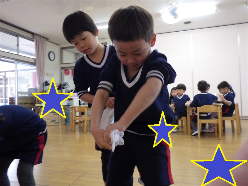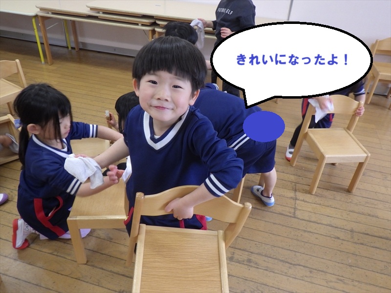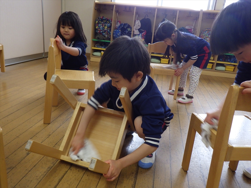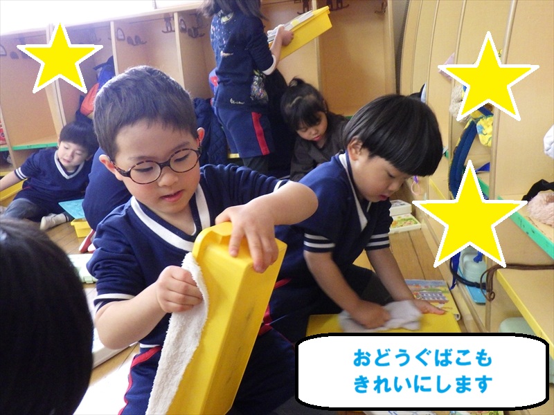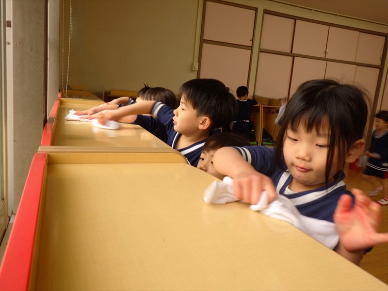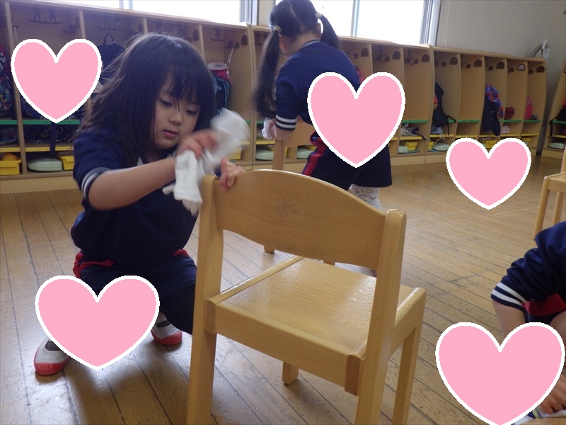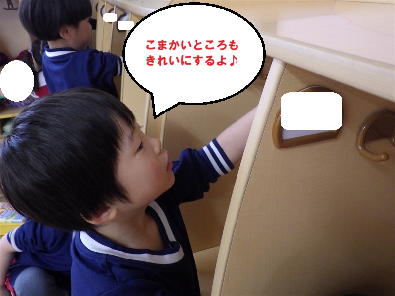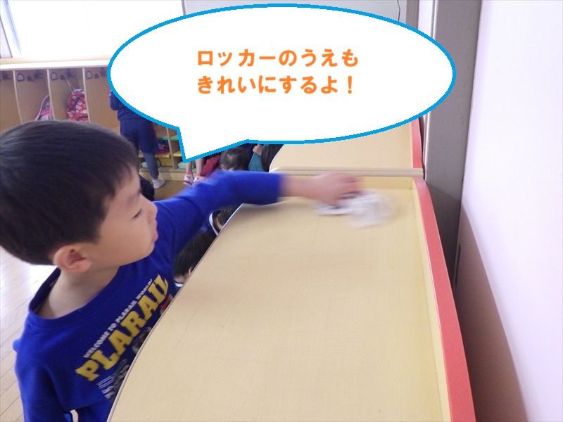 中だけでなく、お道具箱やロッカーの上など自分たちで積極的に拭いていきます。